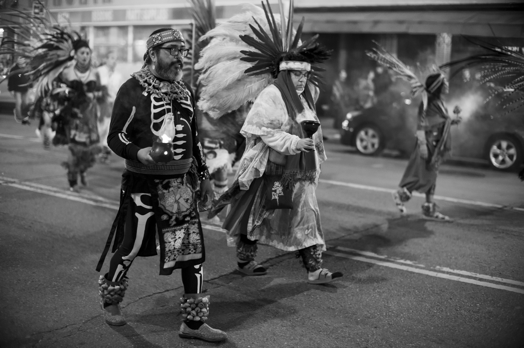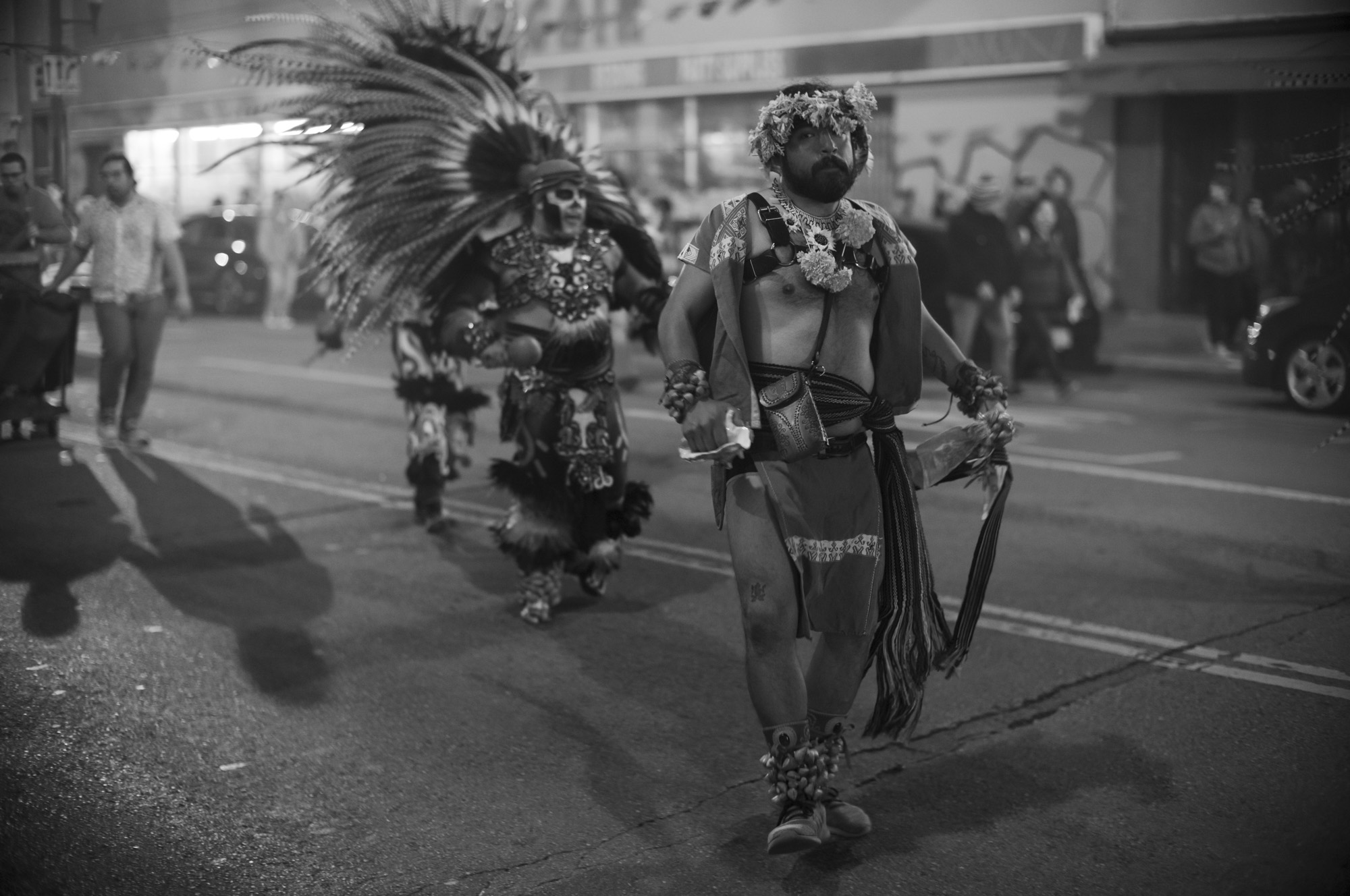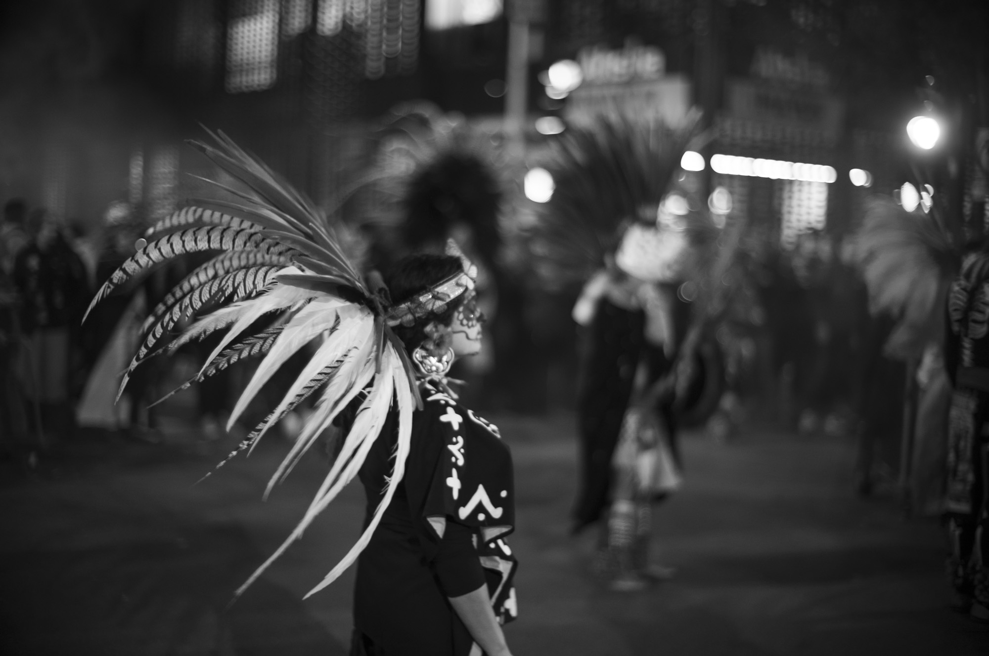 These specific photos were Dia de los Muertos 2024, the parade part in the mission. I showed up a little late and didn’t stay super long, it was cold and I wasn’t feeling super sure of myself. The light wasn’t super great, a mix of sodium arc and tungsten that doesn’t expose well and colors just look bad. This is part of why they sat there for such a long time. But tonight, I decided to try them in black and white, almost in passing, and the quick conversion was enough to get me to do a little more work on them, get them to a bloggable state.