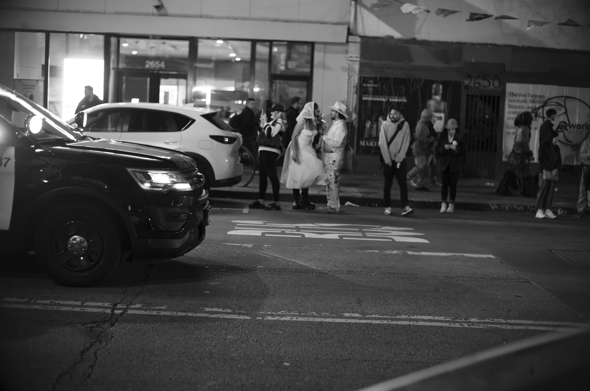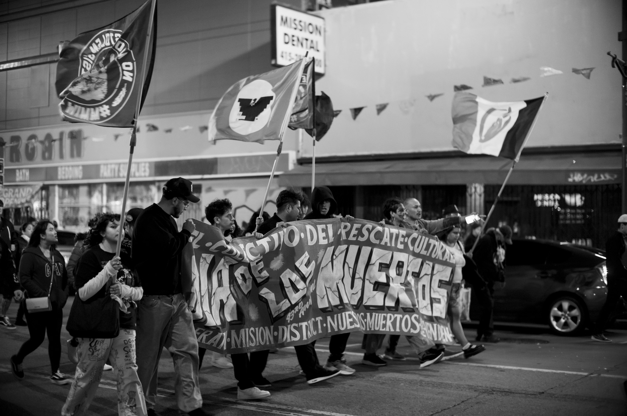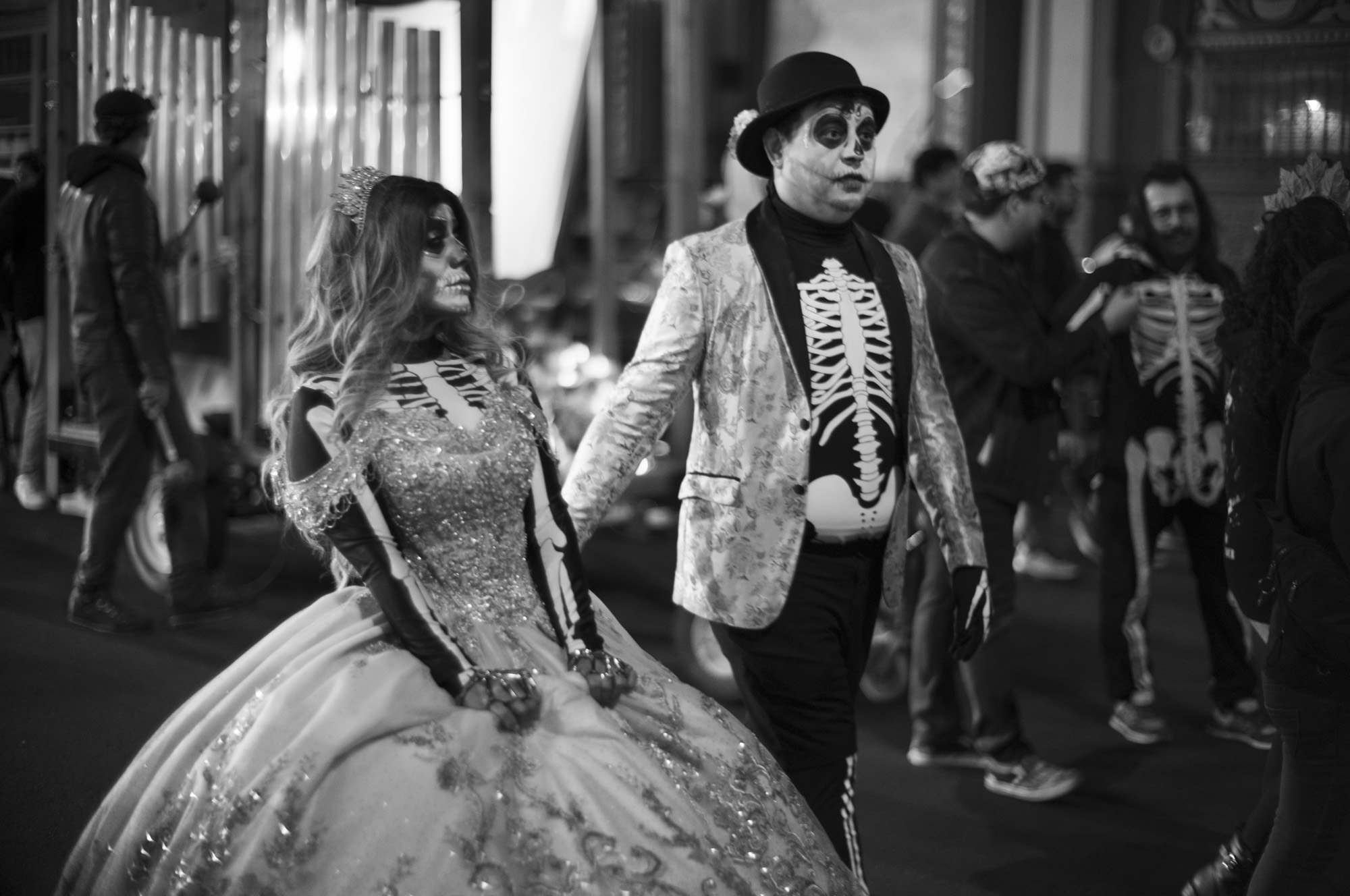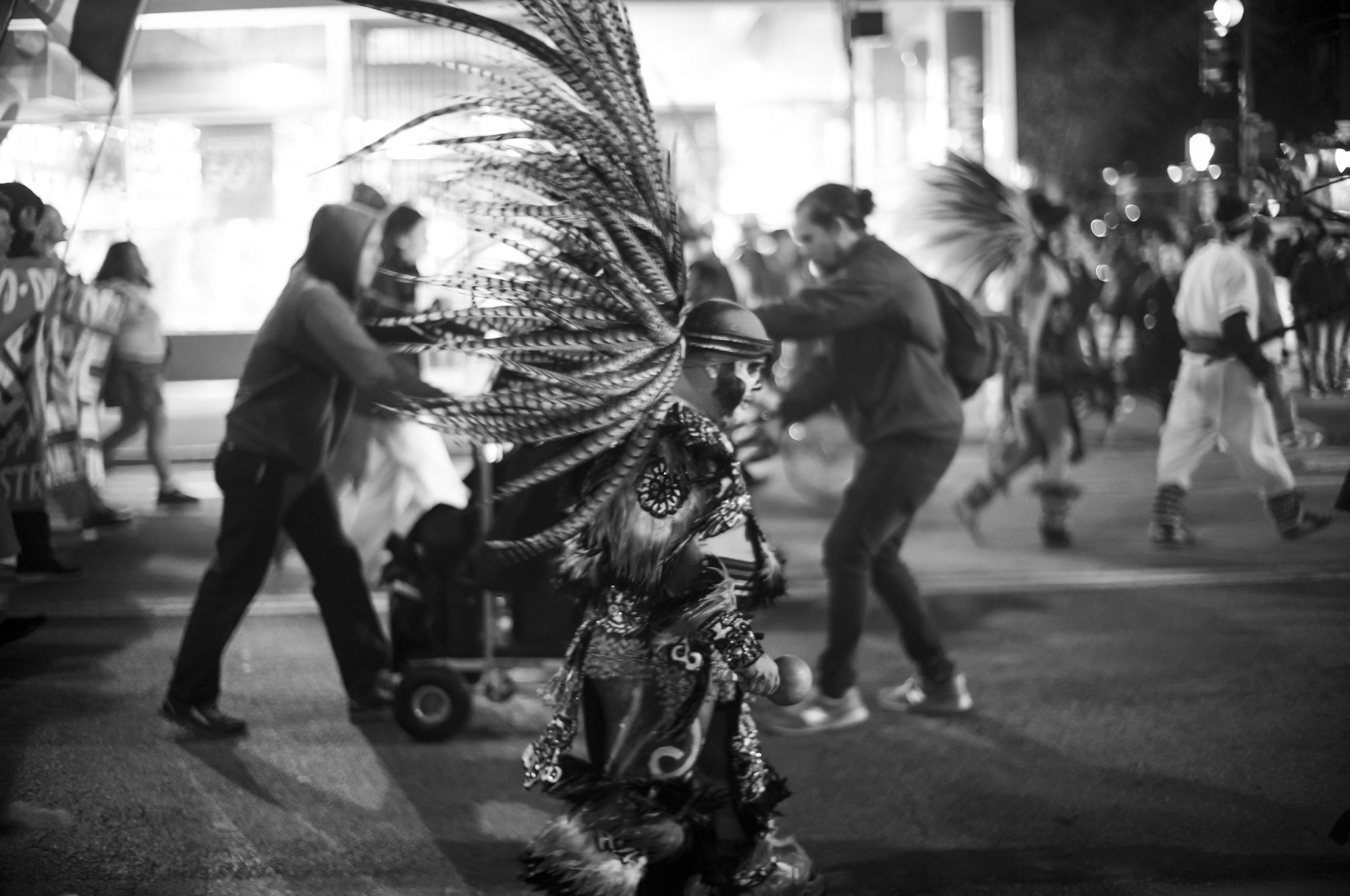 These specific photos were Dia de los Muertos 2024, the parade part in the mission. I showed up a little late and didn’t stay super long, it was cold and I wasn’t feeling super sure of myself. The light wasn’t super great, a mix of sodium arc and tungsten that doesn’t expose well and colors just look bad. This is part of why they sat there for such a long time. But tonight, I decided to try them in black and white, almost in passing, and the quick conversion was enough to get me to do a little more work on them, get them to a bloggable state.